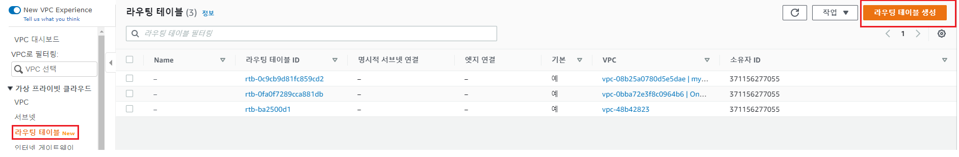 - [라우팅 테이블 생성] 탭을 클릭한다.