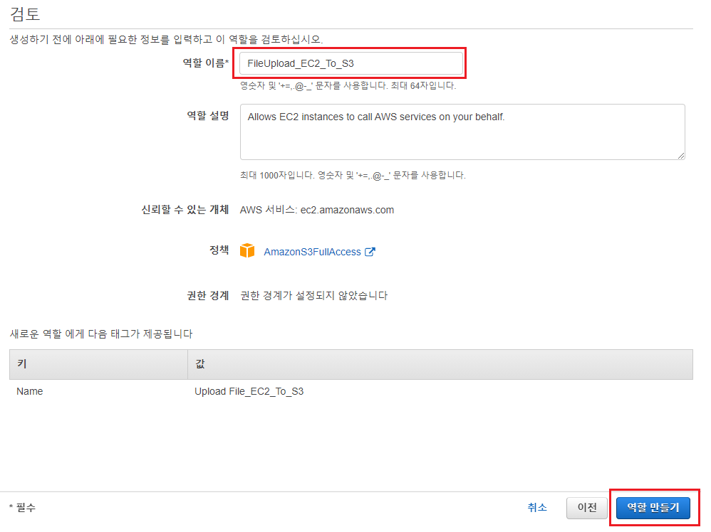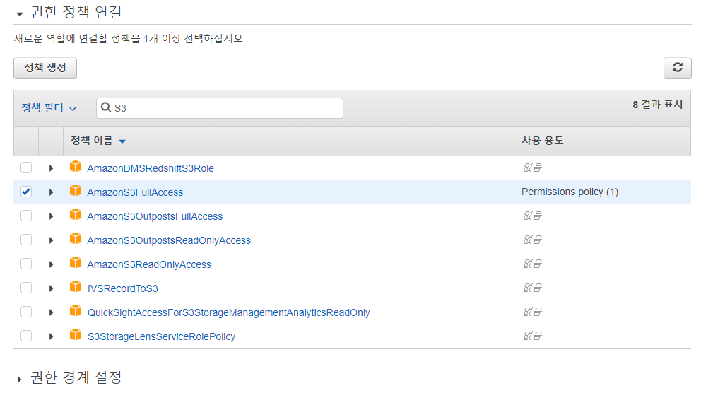 마찬가지로, EC2 인스턴스에서 S3 버킷에 파일을 업로드해야 하기 때문에 "AmazonS3FullAccess"를 체크해준다.