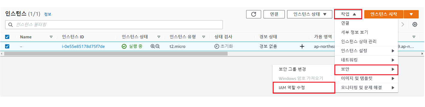 [작업]-[보안]-[IAM 역할 수정]을 클릭한다.