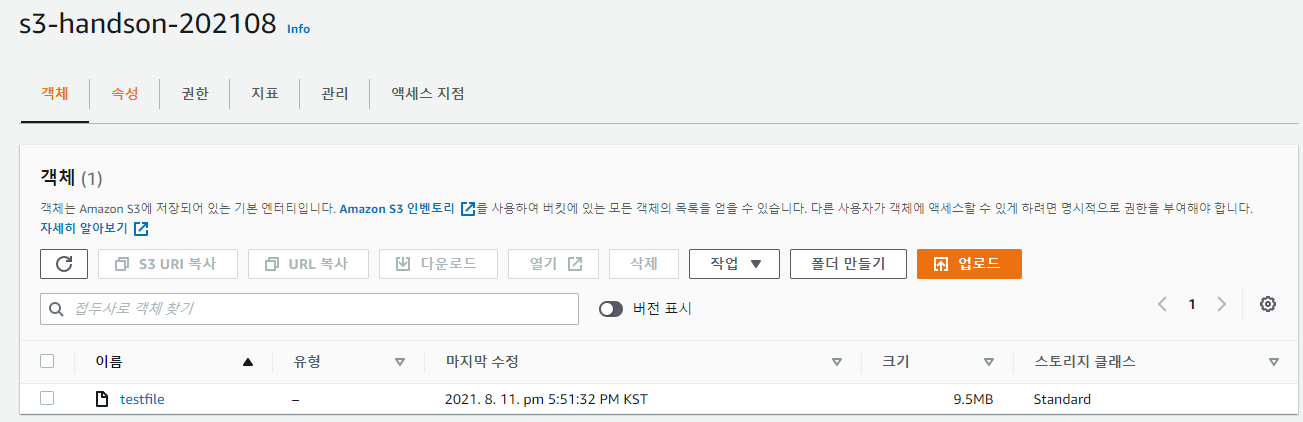 실제 S3 버킷을 확인해보면 testfile이 업로드 된 것을 확인할 수 있다.