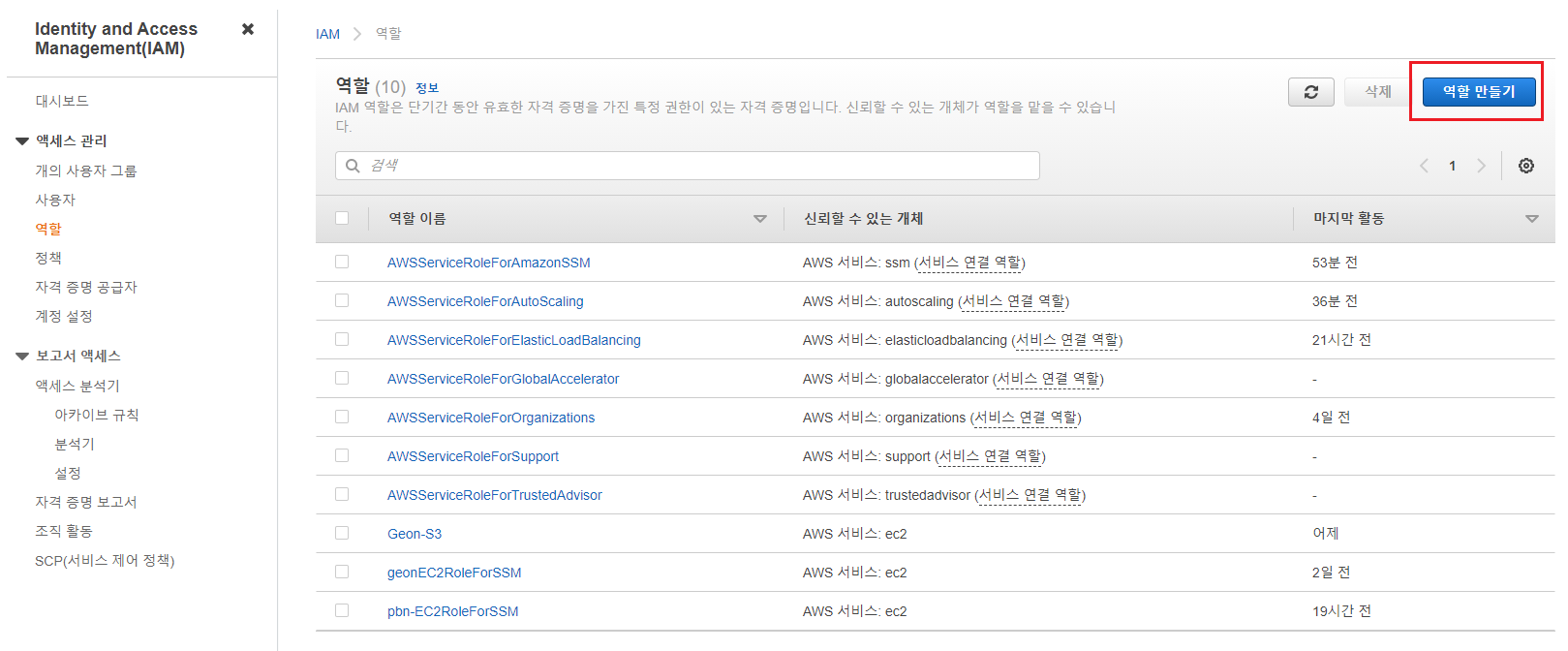 기존 정의된 역할 이외에 [역할 만들기]를 통해 Custom한 역할을 만들어보자.
