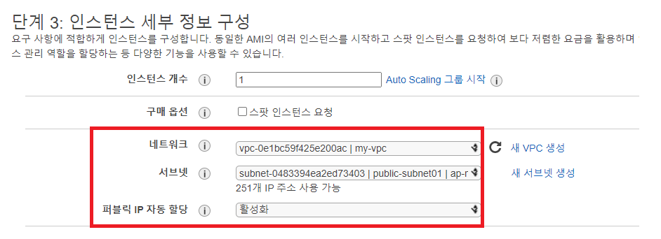 앞서 만들었던 VPC에 생성하기 위해 [네트워크], [서브넷] 부분을 아래와 같이 선택해주자.
