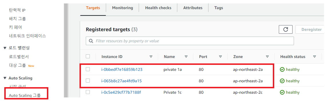 로드 밸런싱의 [대상 그룹]을 확인하면 인스턴스 1대가 추가된 것을 확인할 수 있다.