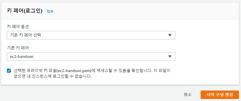 기존 키 페어를 선택하고 [시작 구성 생성]을 클릭한다.