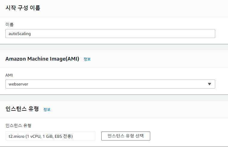 [Auto Scaling]에서 [시작 구성 생성]을 통해 새로운 Auto Scaling을 설정한다.
