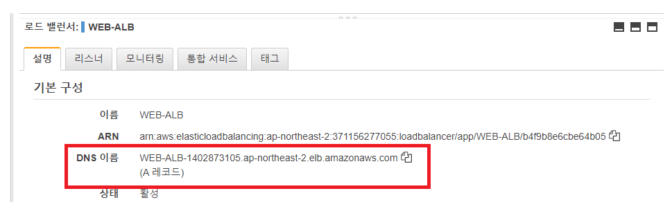로드 밸런서가 활성화되면 dns 이름을 통해 웹 서버를 접속해보자