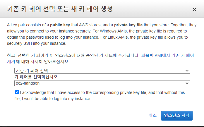 [검토 및 시작] - [시작하기]를 누른 후 [기존 키 페어 선택]에서 사용했던 키를 선택해주자