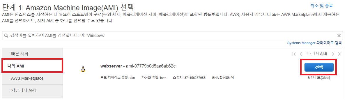 AMI에서 아까 생성했던 이미지를 선택해주고, 인스턴스 유형은 t2.micro를 선택한다.