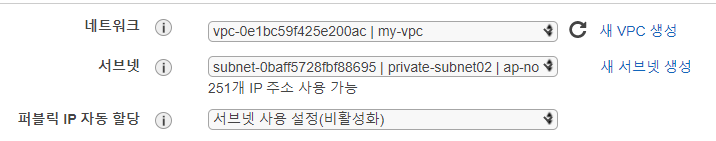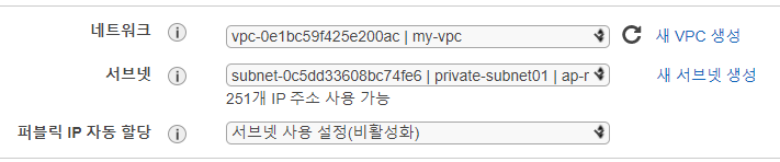 앞서 만들었던 VPC에 생성하기 위해 [네트워크], [서브넷] 부분을 아래와 같이 선택해주자.