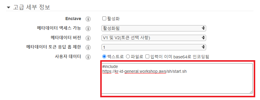 아래 [고급 세부 정보]-[사용자 데이터]에서 아래 정보를 입력하자.