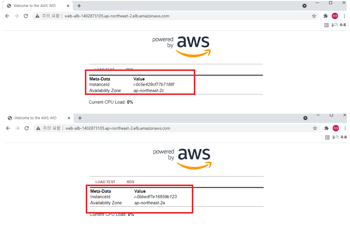 새로고침을 할 때마다 각각 다른 가용영역의 웹 서버로 접속하는 것을 확인할 수 있다.