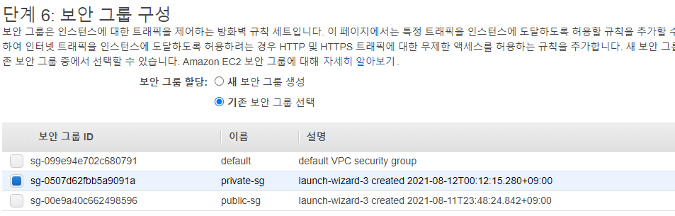 [보안 설정 구성]은 SSL 설정인데 이번 실습에선 적용하지 않으므로, [보안 그룹 구성]으로 넘어간다.