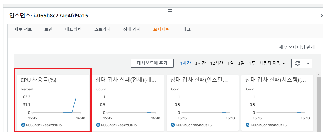 [모니터링]을 통해 인스턴스의 cpu 사용률이 증가한 것을 확인한다.