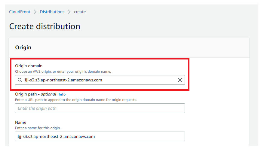 여러 옵션이 있지만 간단한 실습을 위해 S3와 연동하기 위한 "Origin domain" 옵션에서