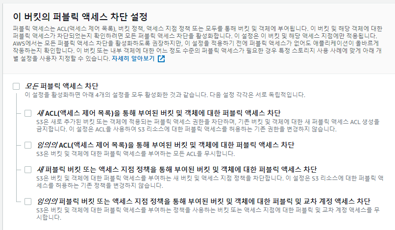 외부에서의 접속 테스트를 위해 "모든 퍼블릭 액세스 차단" 설정은 비활성화 시키도록 한다.