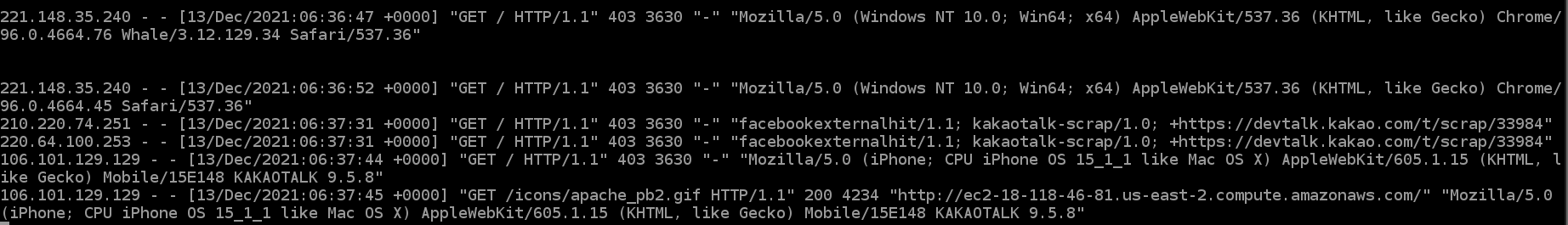 EC2 웹 서버에 할당된 퍼블릭 DNS 주소로 접속한 후 로그를 확인해보자.