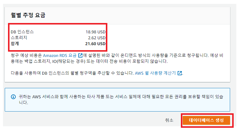 월별 추정 요금을 확인하고 [데이터베이스 생성]을 클릭한다.