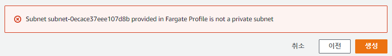 주의할 점은 Fargate의 프로파일을 생성할 때, Pod가 실행될 VPC의 서브넷을 지정하는데