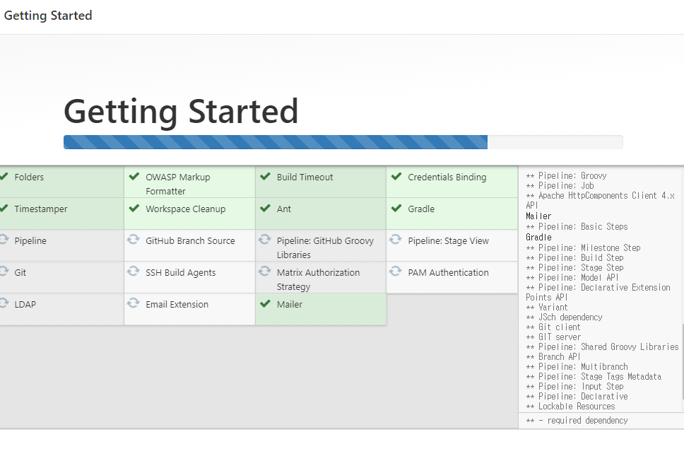 Jenkins에서 지원하는 plug-in을 설치하는 과정이며, 실습 진행을 위해 [Install suggested plugins] 옵션을 선택한다.